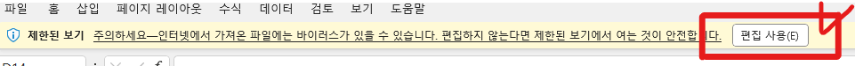 파일을 다운로드하신 후에 상단 우측에 [ 편집 사용 ]을 클릭해야 편집이 수월하게 진행됩니다.