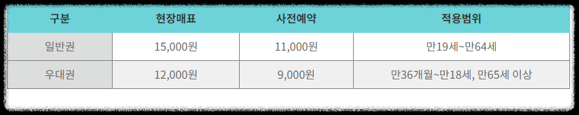 하지만 사전예약시 일반권은 11,000원, 우대권은 9,000원으로 구매가 가능합니다.