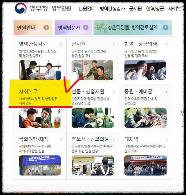 카카오톡 알림을 받은 후, 병무청 홈페이지에 접속합니다. 홈페이지에서는 공익 사회복무요원 신청을 위한 다양한 정보와 절차를 확인할 수 있습니다.