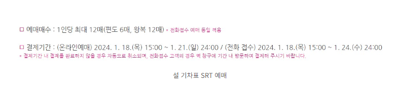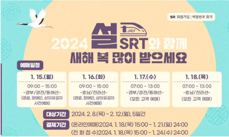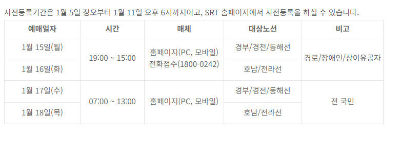 ◆ SRT 예매 일정: · 15(월)~1.16(화) : 경로•장애인•상이유공자 우선