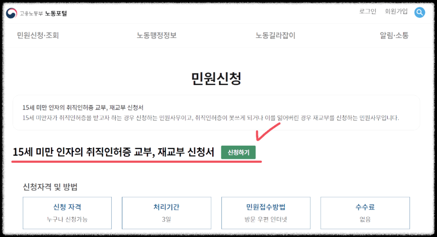 "15세 미만이고 일하고 싶으세요? 온라인으로 쉽게 취직인허가증을 받으세요! 청소년의 권리를 보호하고 안전하게 일하세요. 지금 고용노동부에 신청하세요!"