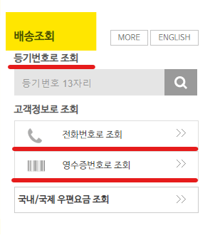 2. 우측 상단 배송조회에서 등기번호 입력 후 검색 버튼 클릭합니다.
