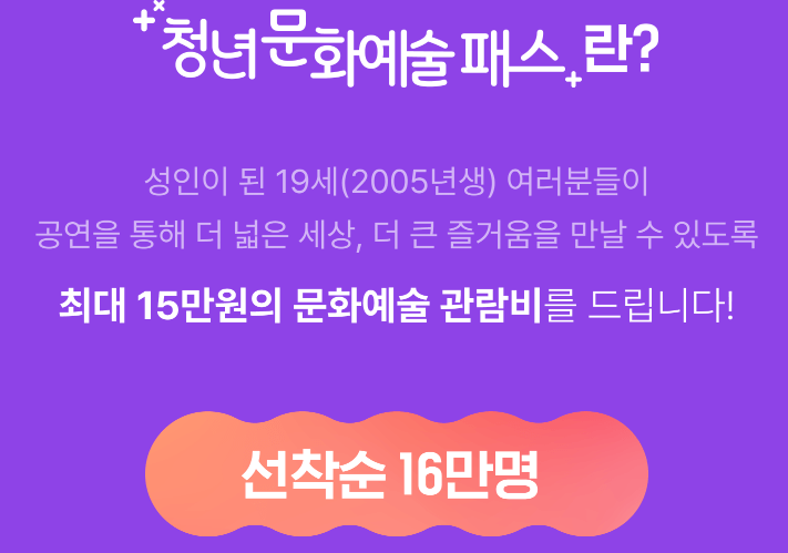 문화예술위원회와 함께 3월 28일(목)부터 올해 19세가 되는 2005년생 청년에게 공연과 전시 예매에 최대 15만 원을 지원하는 청년 문화예술패스를 발급합니다.