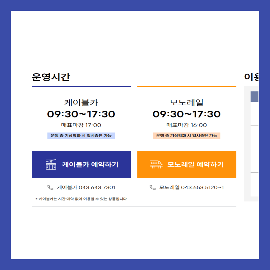 ✅ 청풍호 관광 모노레일과 케이블카는 사전 예약이 필수입니다.