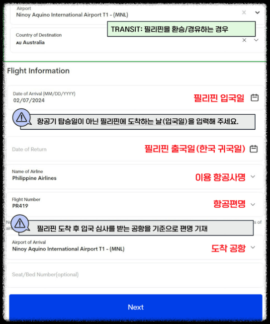 여행 정보: 항공편 정보, 도착 날짜, 필리핀 내 체류할 숙소 정보 등을 입력해야 합니다.