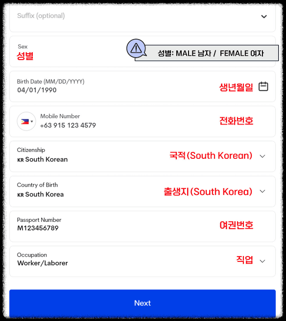 2. 개인 정보 입력: 이름, 성별, 국적, 여권번호, 거주지 주소 등을 입력합니다.