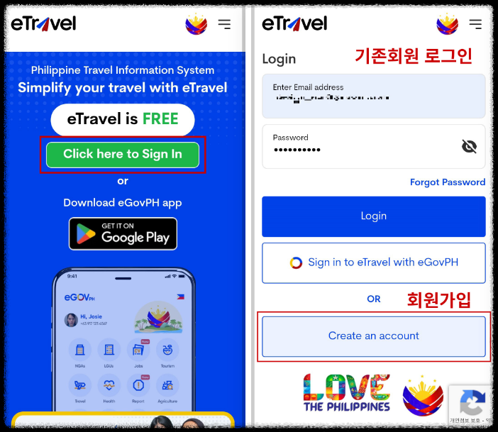 1. 계정 생성: etravel.gov.ph/authentication 페이지에 접속하여 이메일을 등록하고, 받은 OTP 보안코드를 입력하여 비밀번호를 설정합니다.
