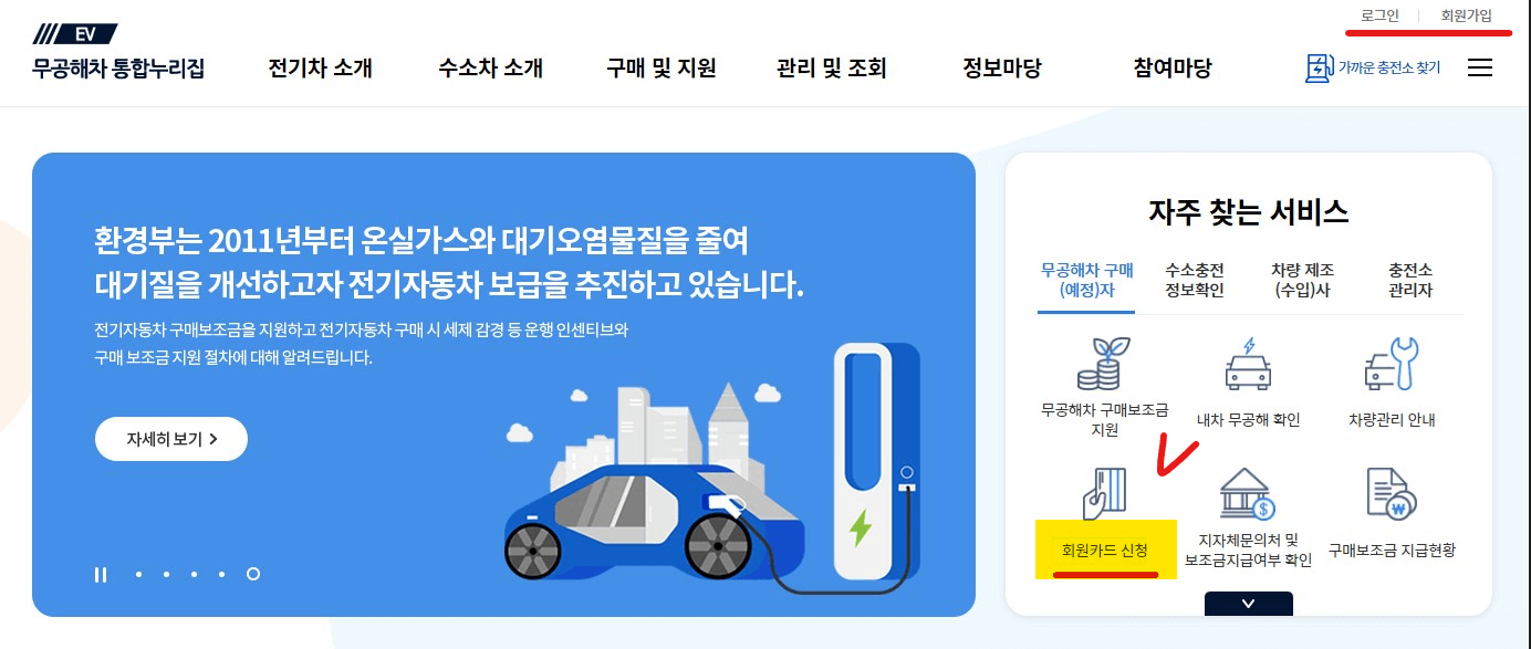 1.환경부 전기차 카드 발급 사이트인 '무공해차 통합 누리집'에 접속합니다.