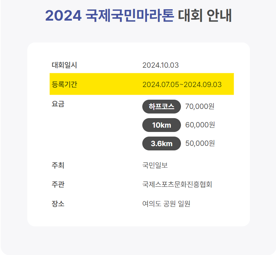 아래 링크를 확인하시면 2024 국제국민마라톤 홈페이지에서 바로 신청하실 수 있습니다.