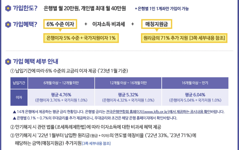 또한 이자 소득은 비과세 처리가 되며, 매년 매칭지원금 비율이 올라가고 있기 때문에 가입을 안 하면 오히려 손해가 됩니다.